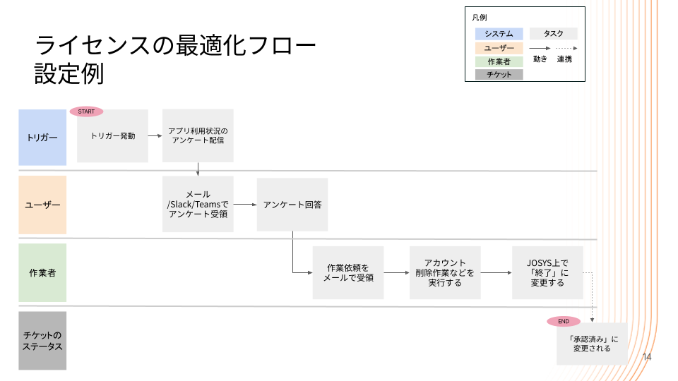 本ページでは、Josysの ワークフロー機能 のテンプレート:ライセンスの最適化 を利用したワークフローの作成方法について紹介します。ワークフローに関しては下記のヘルプページをご参照ください。