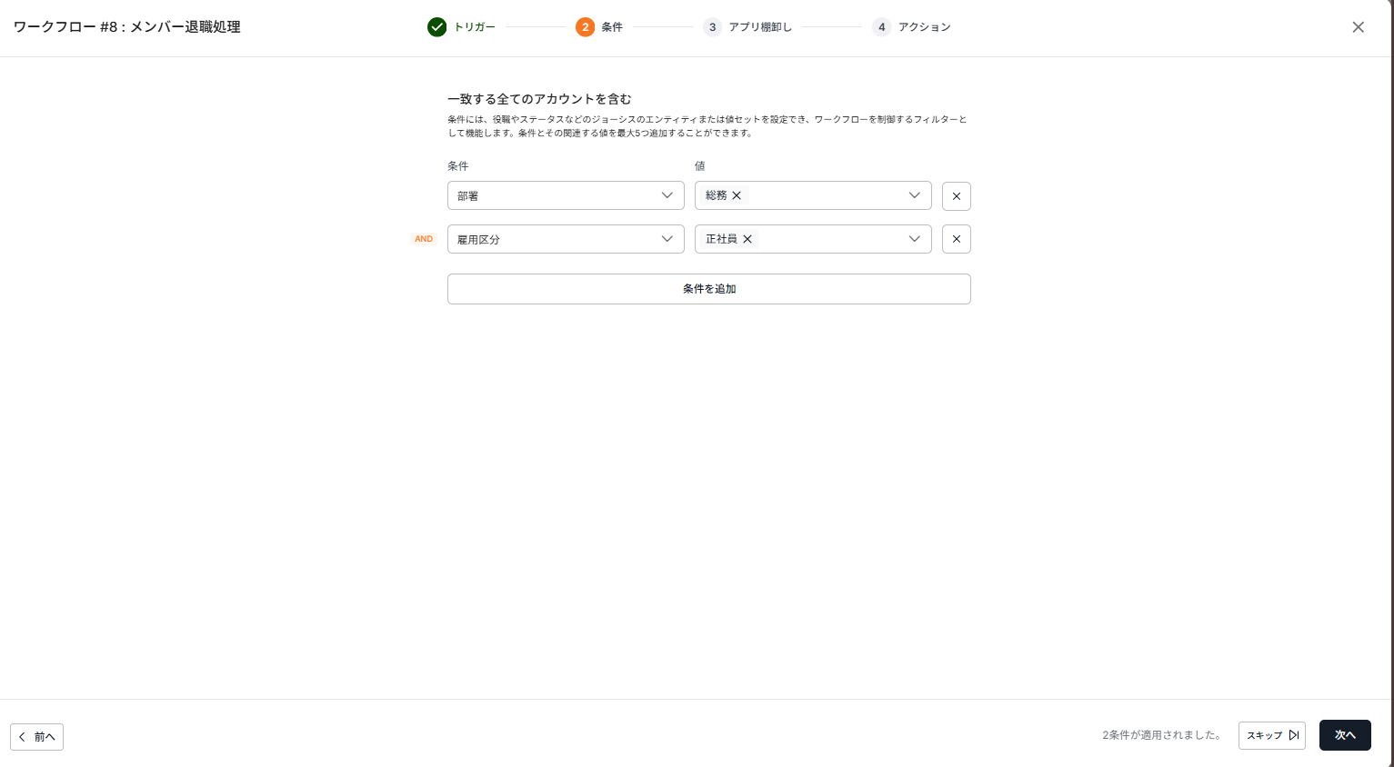 部署ごとや、役職、雇用区分ごとなどで発行したいアプリの内容が変わる場合、条件を設定し、右下の「次へ」をクリックしてください。条件が不要であり、すべての社員に共通してアカウントを発行したい場合は右下の「スキップ」をクリックしてください。