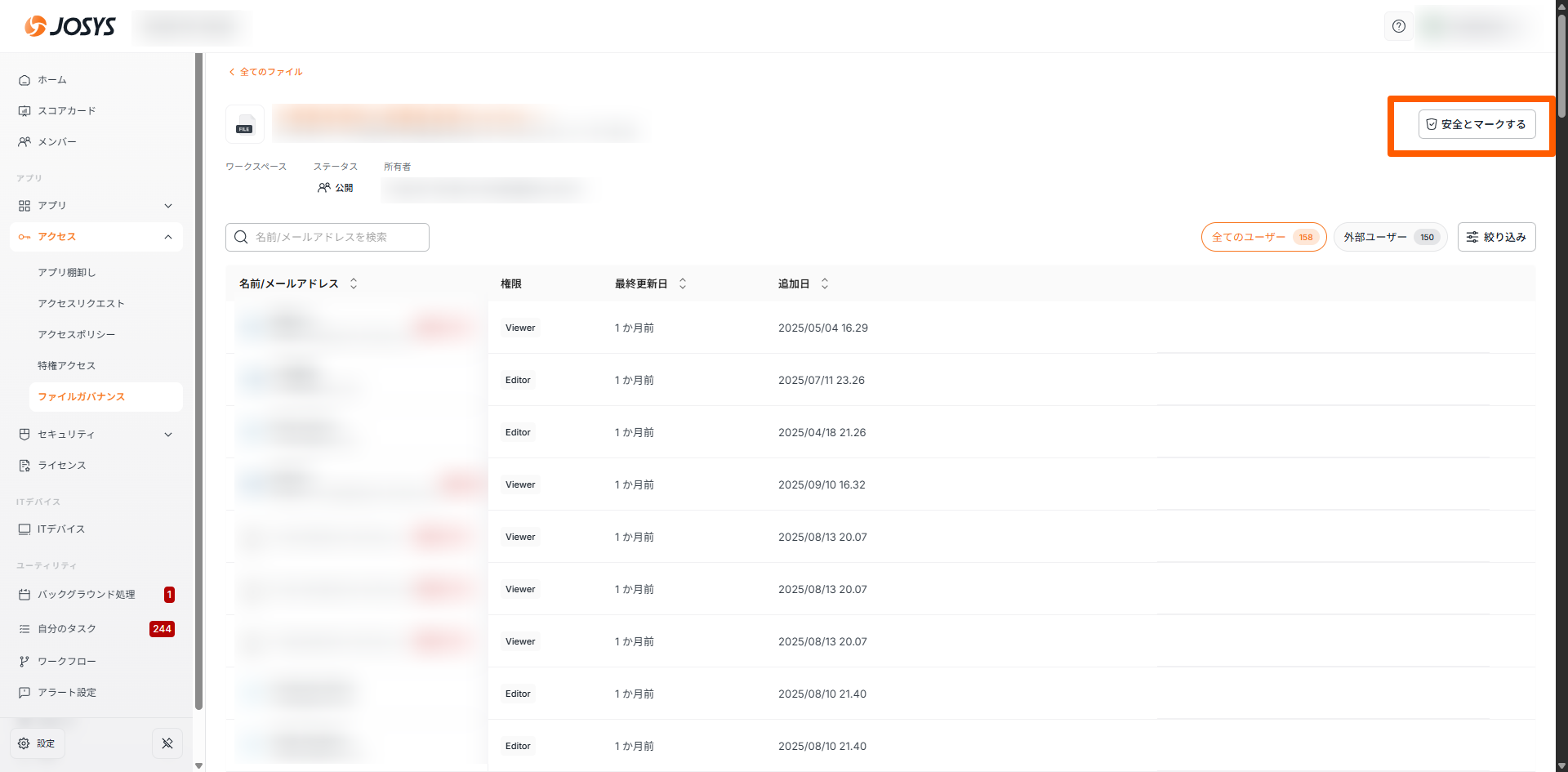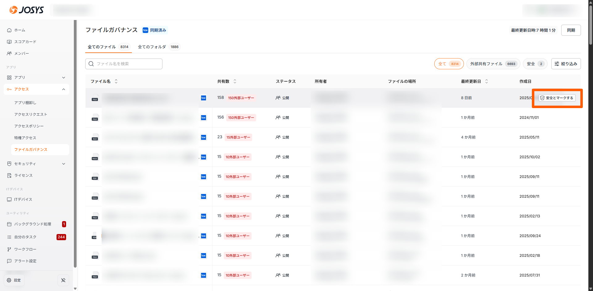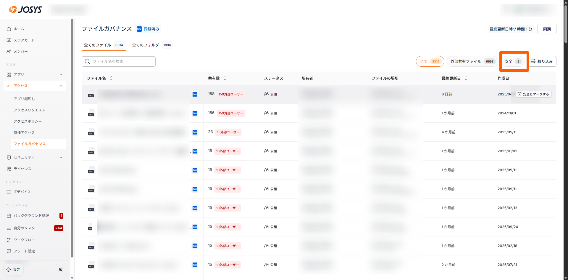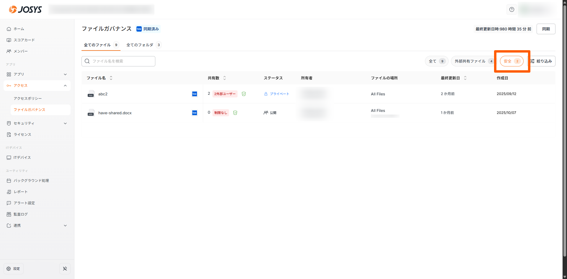 - 「安全」とマークされたファイルは、[外部共有ファイル]に表示がされなくなり、[安全]に表示がされるようになります。