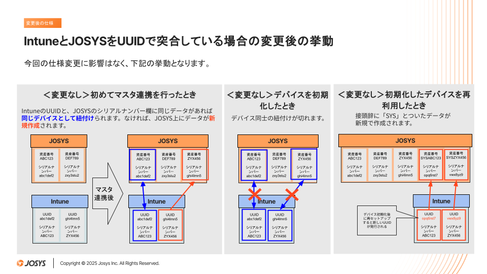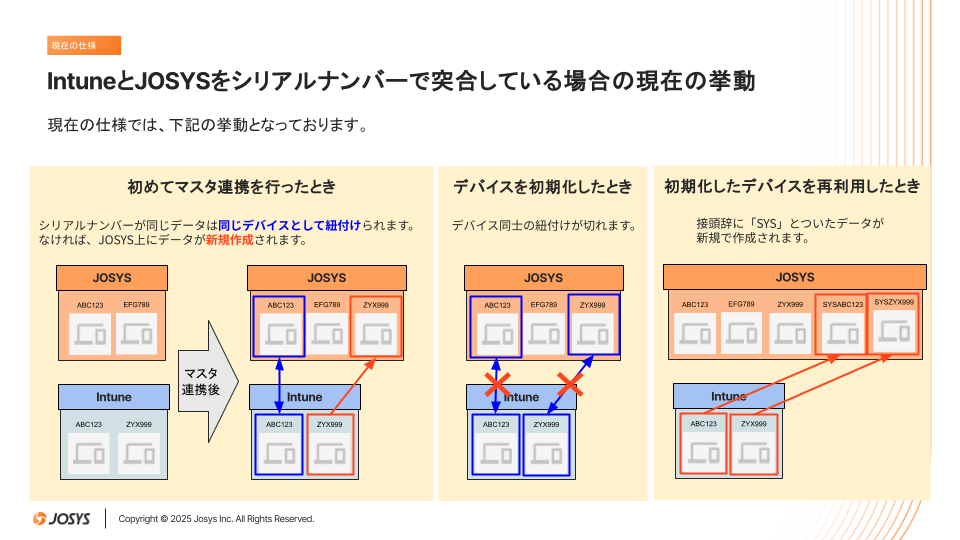 現在、Intuneで管理されているデバイスを初期化後に再利用する際、JOSYS上のデバイス台帳が重複して作成されることを防ぎ、過去の資産情報と現在の利用状況を一貫して管理できるようにするため。