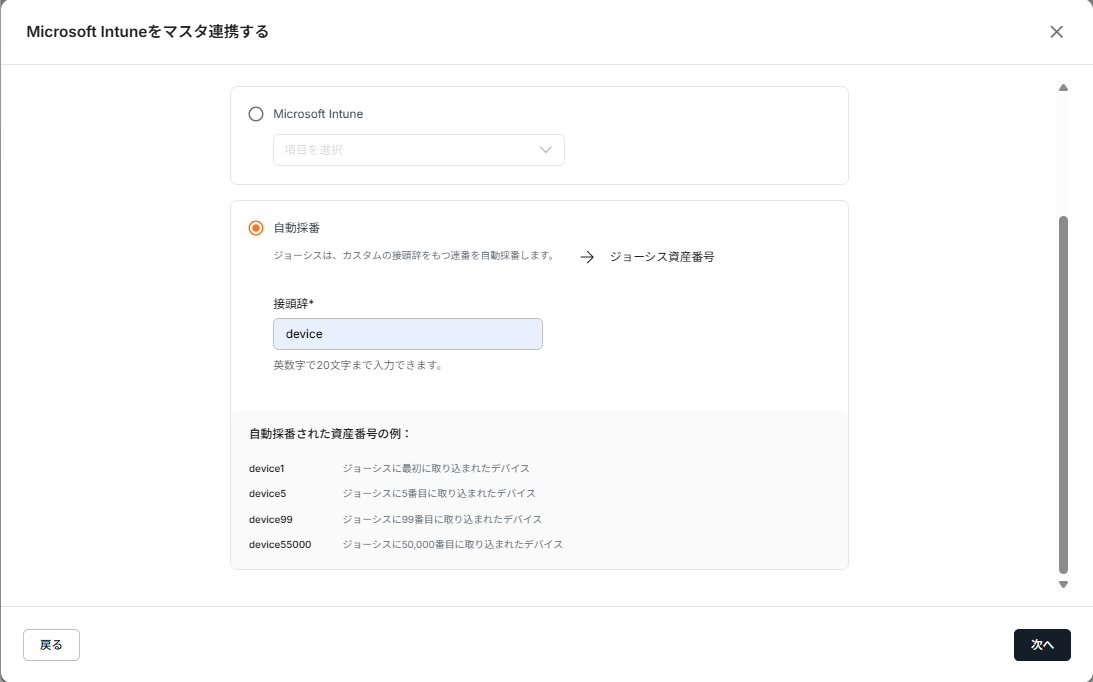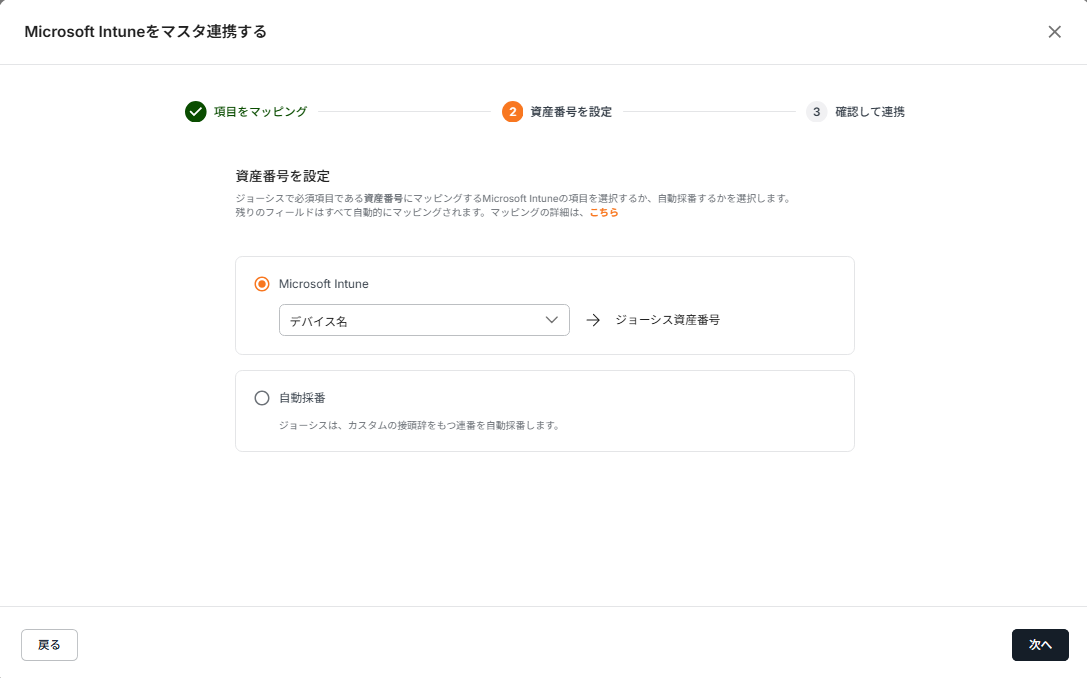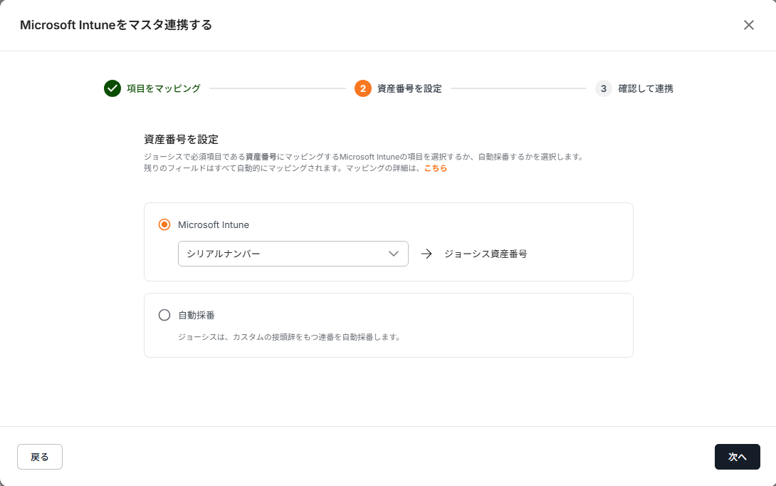 資産番号の設定により挙動が異なります。 ①資産番号にIntuneのUUIDがマッピングされるようにしている場合 ②資産番号にIntuneのシリアルナンバーがマッピングされるようにしている場合 ③資産番号にIntuneのデバイス表示名がマッピングされるようにしている場合 ※ジョーシスのデバイス台帳の資産番号欄は重複を禁止しているため、同じ資産番号のデータの作成を回避するために接頭辞「SYS」がつきます。 ④資産番号に自動採番を設定している場合 |