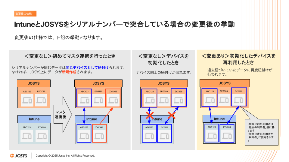 下記はIntuneとジョーシスのシリアルナンバー同士でデータを突合後、ジョーシスの資産番号にIntuneのシリアルナンバーが入るように設定されている場合の挙動を説明したキャプチャです。初期化したデバイスを再利用した場合の挙動に変更があります。