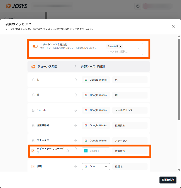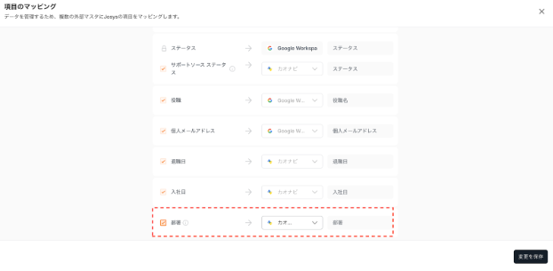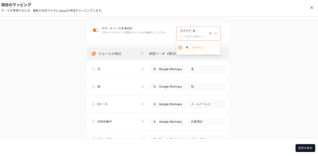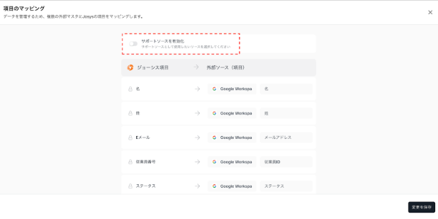 ・プルダウンメニューから、利用するサポートソースを再選択します。 - 項目のマッピング確認と保存