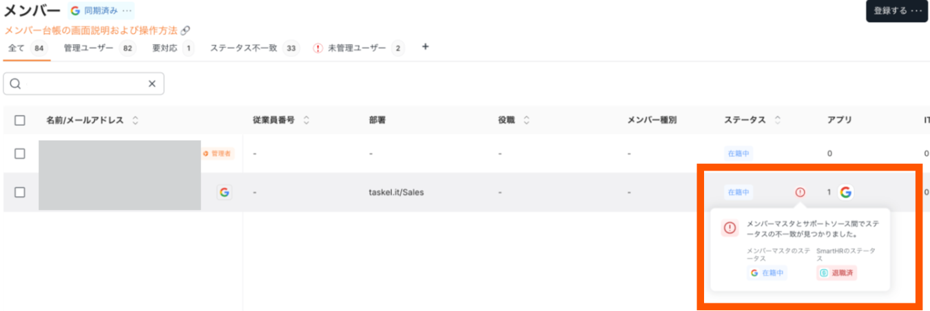 ステータス欄は、プライマリソースと、サポートソースの2つがマッピングされます。二つのソースからステータスを取得することで、それぞれのマスタで異なるステータスが設定されていた場合にステータスの不一致アラートが表示されるようになります。