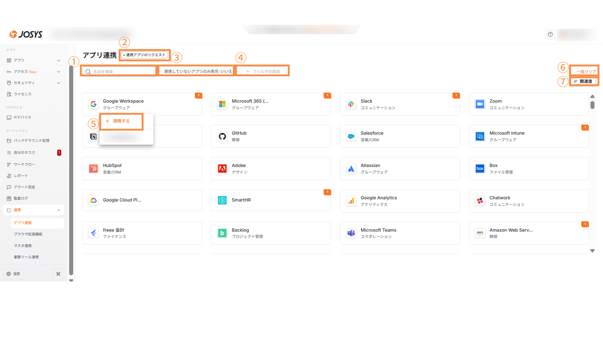 | ② | 連携アプリのリクエスト | Josysの連携対象外アプリをリクエストできます。 |