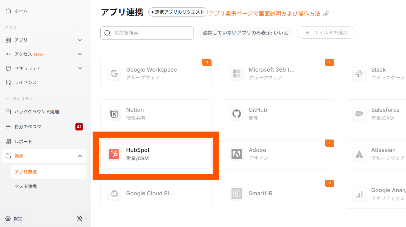 - 検索ボックスから、連携対象のアプリを検索してください。対象のアプリだけが有効化されており、クリックができます。
