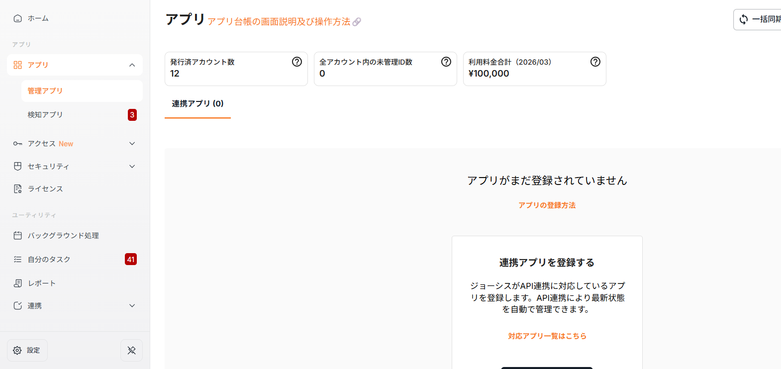 - Josys管理画面から「連携」>「アプリ連携」を選択します。